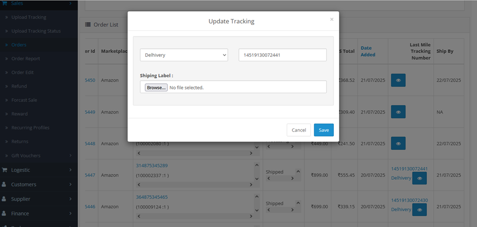 • Select the shipping method (e.g., ExpressBee, Bluedart, etc.)